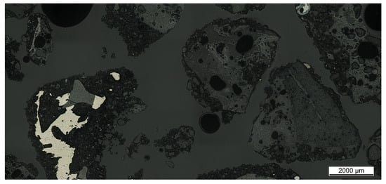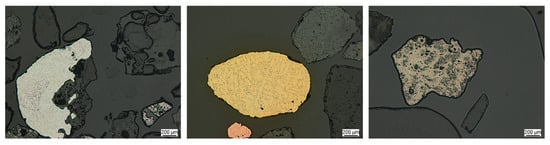 If a detailed analysis of certain particles’ macrostructure and chemical composition was necessary, the metallography technique was employed by employing a light microscope and scanning electron microscope with energy-dispersive X-ray spectroscopy (SEM/EDS). In this case, the studied sample was mounted in resin, followed by a sample preparation involving grinding and polishing. During the metallography analysis using a light microscope, a stitching approach was also carried out in addition to a single take of one image. Specifically, several metallography images were captured and compiled automatically into an overview image to provide a broader perspective of the sample structure.