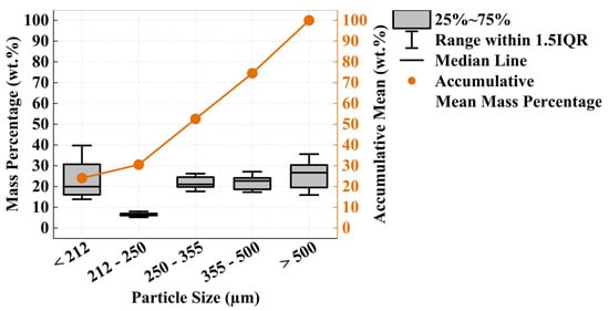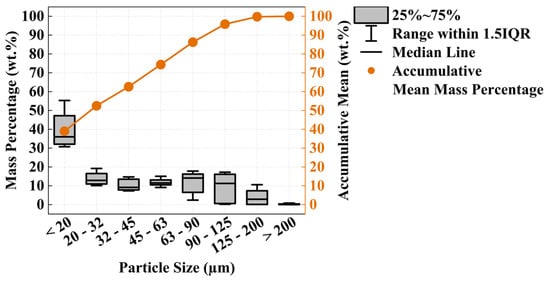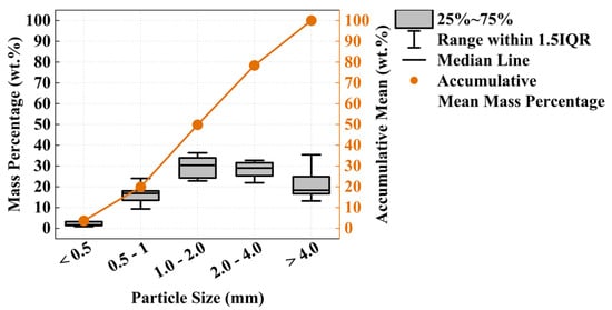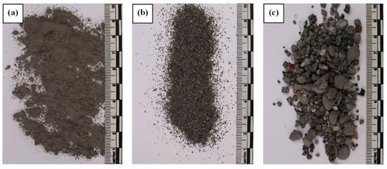 Complementary to the physical appearance of the fine, middle, and coarse fractions in Figure 6, sieve analysis was performed to describe the size distribution of each milling product. These results documented that the fine fraction has a predominant particle size of <200 µm (Figure 7), whereas its dominant fraction has a particle size of <20 µm. The particle size of the middle fraction (Figure 8) ranges in between the fine and coarse fractions with a relatively uniform distribution of sieve classification from 0.2 to 0.5 mm. In contrast, the coarse fraction (Figure 9) consists of a particle size of >0.5 mm yet is dominated by a grain size range of 1–2 mm, indicating that the original pr.IBA input materials are ground to a certain degree before yielding a coarse fraction.