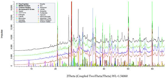Several chemical composition analyses were subsequently conducted to characterize the effect of the selective milling operation. The first approach was an XRD analysis of the primary sample considered in this study (pr.IBA 0–10 mm) for both the as-received condition and all its milling products. As shown in Figure 10, numerous indivisible peaks are recorded, representing various unquantifiable phases in those selected samples. In this instance, it is substantiated that the pr.IBA is still a heterogeneous material, whether before or after the selective milling process has been carried out.