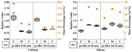 The enrichment pattern measured in the milling product of pr.IBA 0–10 mm was further amplified by the chemical composition analysis performed using the XRF method. As documented in Figure 11, calcium enrichment is observed in the fine (F) fraction, and the highest silicon concentration is recorded in the middle (M) fraction. Notably, the construction of the gray boxes follows a similar approach indicated by the legend in Figure 7, Figure 8 and Figure 9. The difference is that the gray boxes in this chemical composition diagram represent a normalized value (scale on the left Y-axis) relative to the as-received concentration provided in Table 1; meanwhile, the average measured content (wt.% or ppm) in all products is provided by the orange dots (scale on the right Y-axis). In addition, as a comparison, the results for all milling products for pr.IBA 10–32 mm are also provided. In this specific case, a similar tendency is elucidated for calcium and silicon in Figure 11.