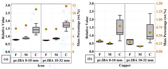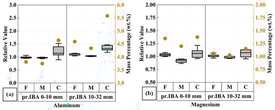 Other elements also presented a comparable tendency in the chemical composition of all the milling products between the pr.IBA 0–10 mm and 10–32 mm. In the case of the coarse (C) fraction, iron enrichment is further substantiated in Figure 12a, as previously mentioned in the XRD results. This significantly higher iron content than that of the fine and middle fractions, which are relatively close to each other, is incongruent with the pattern in calcium. Interestingly, this segregation pattern of iron also applies to the copper content in Figure 12b, where notable concentrations can be detected in the coarse fraction. However, in the case of copper, the lowest content was measured in the middle fraction instead of in the fine fraction. A lower gap in the concentration difference for both pr.IBA 0–10 mm and 10–32 mm can be observed in aluminum and magnesium, the two other major components of the milling products considered in this study. As documented in Figure 13, a modest enrichment in the coarse fraction is represented, particularly for aluminum. In the case of magnesium, the disparity is narrower. However, the lowest magnesium content is measured in the middle fraction, parallel to the recorded tendency for aluminum and copper, but it contradicts the silicon pattern.