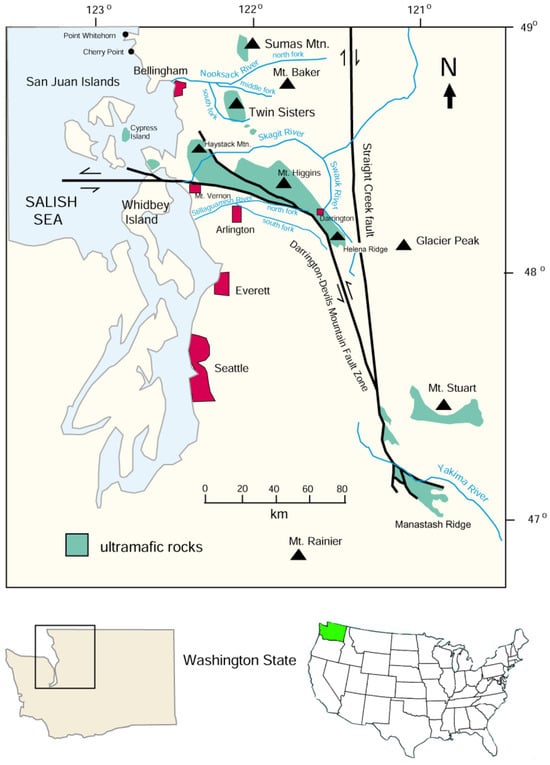 - Graham, D.C. Hydrothermal Alteration of Serpentinite Associated with the Devils Mountain Fault Zone, Skagit County, Washington. Master’s Thesis, Geology Department, Western Washington University, Bellingham, WA, USA, 1988; 125p. [Google Scholar]