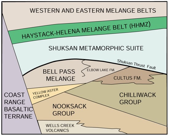 - Tabor, R.W. Late Mesozoic and possible early Tertiary accretion in western Washington State: The Helena-Haystack mélange and the Darrington-Devils Mountain fault zone. Geol. Soc. Amer. Bull. 1994, 106, 217–232. [Google Scholar] [CrossRef]