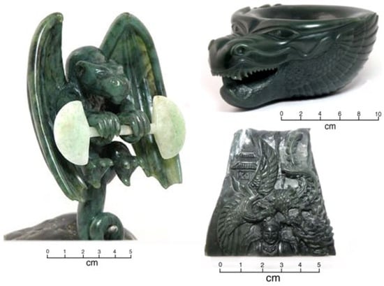 Because of its ability to withstand abrasion and impact, nephrite has been used for making stone tools since Neolithic times. These properties, combined with the attractiveness of its color and pattern, also led to the use of nephrite for decorative purposes, including intricate works of art. One of the earliest known locations for the artistic use of jade is in China, where the Xinglongwa Culture (6200–5400 BC = 8150–7350 BP) marked the beginning of jade preeminence in East Asia [15]. Green nephrite was being used for tool-making in Taiwan at ~4500 BP. Within 1000 years, these artifacts were spreading to other southeast Asian islands beyond the Philippines. The mass production of nephrite ornaments began in Taiwan at ~2500 BP, becoming widespread in southeast Asia until ~1000 BC (~2050 BP) [16,17,18,19]. Another early location is in the Baikal Lake area, Sakha Republic, Russia, where nephrite adzes and ornamental rings come from a site dated at 2930 BC (=4880 BP) [20].