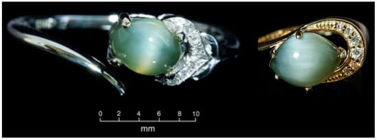- Hogarth, E. Cat’s eye nephrite jade from Washington State. Gems Gemol. 2019, 55, 124–125. [Google Scholar]