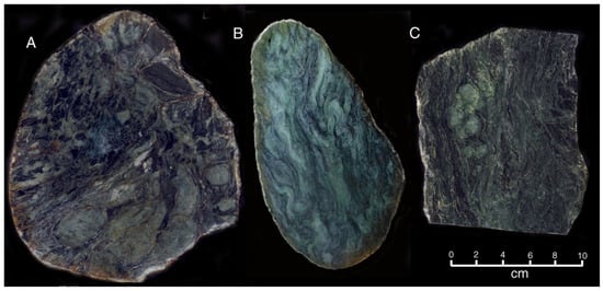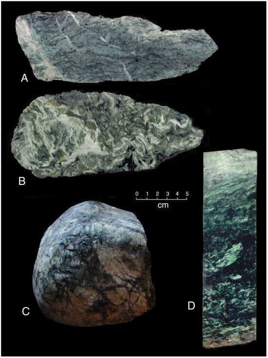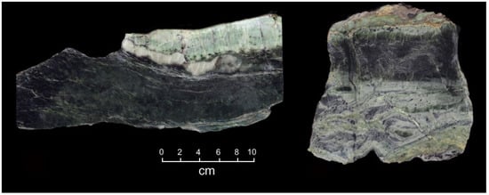 - Tarling, M.S.; Smith, S.A.F.; Negrini, M.; Kuo, L.-W.; Wu, W.-H.; Cooper, A.F. An evolutionary model and classification scheme for nephrite jade based on veining fabric development, and the role of dissolution-precipitation. Sci. Rep. 2022, 12, 7823. [Google Scholar] [CrossRef]