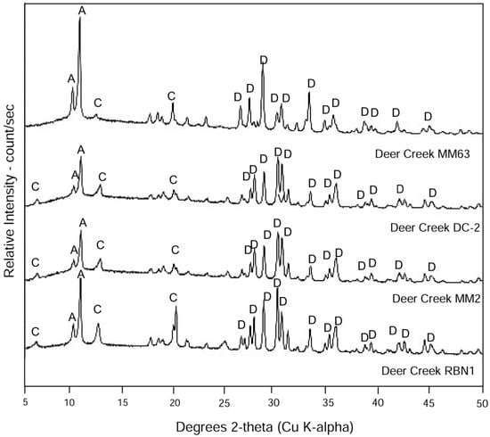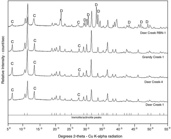 XRD patterns are important tools for characterizing the composition of nephrite and associated materials. Members of the actinolite/ferro-actinolite solid solution series have a range of lattice parameters that hinders precise determinations of their mineral composition based on XRD patterns. Figure 14 shows diffractograms for alluvial nephrite specimens collected from the DDMFZ at Deer Creek, and for a Grandy Creek specimen that originated from the Twin Sisters ultramafic body. Peaks measured from a single actinolite crystal from Lake Wenatchee, Washington, are shown as a reference. The nephrite patterns are generally very similar, except for Deer-Creek RBN-1, which shows diopside to be a major constituent. All specimens show prominent peaks for clinochlore.