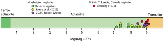 Mg/(Mg + Fe) ratios show that Washington State nephrite samples have compositions that range from actinolite to tremolite. Nephrite specimens analyzed from the Cassiar and Omimeca regions of British Columbia, Canada, mostly show tremolite compositions. Data from [8,29,36].