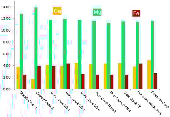 SEM/EDS elemental data are only semiquantitative, but they are sufficient to provide a basis for the interpretation of mineralogy. The atomic % values for major elements (Table 1) are useful for distinguishing between tremolite [Ca2(Mg5.0–4.5Fe2+0–0.5)Si8O22(OH)2], actinolite [Ca2(Mg4.5–2.5Fe2+0.5–2.5)Si8O22(OH)], and ferro-actinolite [Ca2(Mg2.5–0.0Fe2+2.5–5.0)Si8O22(OH)2]. Members of the tremolite/ferroctinolite series can be distinguished by their Mg/(Mg + Fe) ratio [34,35]. Tremolite is characterized by a ratio of >0.9, actinolite has ratios of 0.5–0.9, and ferro-actinolite can be identified by a ratio of <0.5. The values in Table 1 show that the samples lie close to the tremolite/actinolite boundary based on their Mg/(Mg+Fe) ratios, depicted visually in Figure 15.