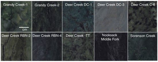 Jade-producing locations in Alaska, British Columbia, Wyoming, and California have long histories, but jade in Washington State attracted little attention prior to the 1970s, when commercial operations began. Although amateur collectors have found jade and related rocks in many locations, commercial activity has mostly been focused on sites in the North Cascade foothills. An early article [14] was supplemented by a more recent publication [5]. Commercial mining activity has been focused on areas where nephrite occurs in bedrock exposures. Brief published descriptions have focused on gemological characteristics [6,7]. A more technical report [8] included detailed analytical data for nephrite jade and pleochroic tremolite/actinolite from a mining site near Darrington, WA, USA.