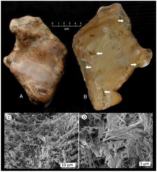 Light brown nephrite, Deer Creek specimen MM38, consists of tremolite with minor green chlorite. (A) Exterior surface, showing rounding from stream transport. (B) Sawn section, with chlorite zones marked with arrows. (C,D) SEM secondary electron images showing felted texture.