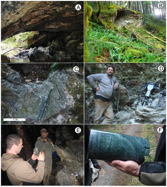 Bedrock occurrences of nephrite in the DDMFZ. (A) Jade Cave claim. (B) Bedrock outcrop, Mt. Higgins south slope. Photos courtesy of WashingtonJade.Com (C). Nephrite-bearing outcrop, Lucky’s Dream claim, Helena Ridge. (D,E) Claim operators Timotheus Kester and Jason Henry, HM claim, Helena Ridge. (F) Diamond drill core of nephrite from HM claim. Photos (A,B) courtesy of Rodney and Nathaniel Cook. Photos (D–F) by the author.