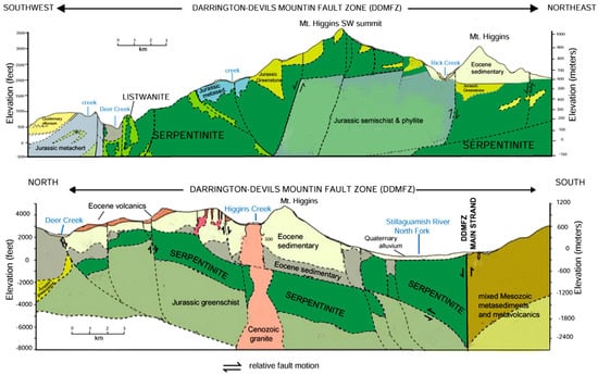 Serpentinite bodies also occur outside of the DDMFZ, typically located along deep faults that have allowed for the upward transport of mantle peridotites. These range in volume from small lenses to the marginal zones of the massive dunite of the Twin Sisters Range (Figure 4) [12], and a large outcrop zone on the west side of Sumas Mountain in northern Whatcom County, Washington.