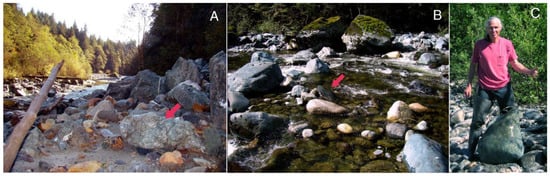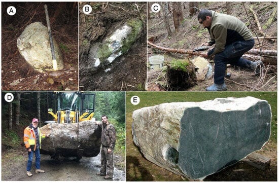 The modern mining of British Columbia nephrite dates to 1938, when boulders were discovered in placer deposits in the Cassiar District. In the early 1950s, nephrite boulders weighing up to 10 tons were found along the Fraser and Bridge Rivers near Lillooet, B.C. Later, bedrock deposits in the Cassiar and Omineca areas became major localities for Canadian nephrite mining [28,29,30]. In Washington State, commercial nephrite activity has been focused on bedrock occurrences of nephrite on the western side of the North Cascade Range, with most prospecting focusing on serpentinite bodies exposed along the Darrington–Devils Mountain Fault zone in the Skagit and Snohomish Counties [5]. Rock and mineral occurrences on Salish Sea beaches have largely been the domain of amateur collectors [4].