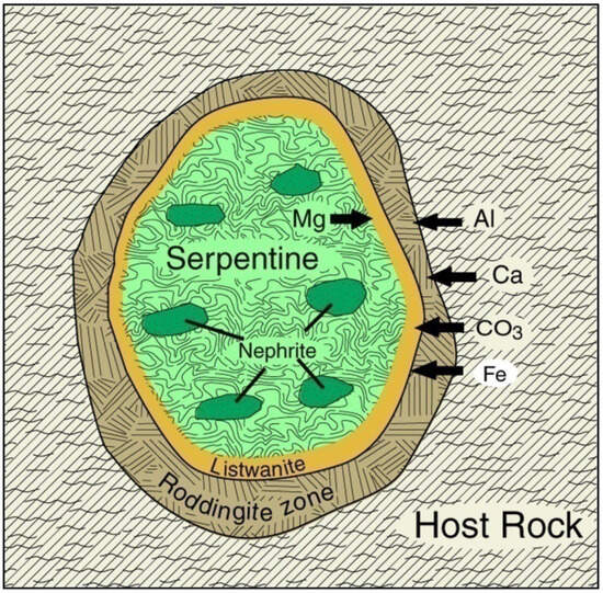 The petrogenesis of jade and related rocks is a challenging topic because of the complexities inherent in the formation of metamorphic mineral assemblages. For nephrite, the parent material is serpentinite, a rock composed primarily of members of the serpentine family (lizardite, antigorite, and chrysotile). These magnesium silicate minerals are produced by the alteration of ultramafic mantle material (peridotite or pyroxenite) that has been brought to shallow depths by deep-seated faults. These faults are the result of tectonic forces typically associated with subduction zones. Because of this origin, jadite has been referred to as a “plate tectonic gemstone” [9]; the same description can be applied to most nephrite. An exception is the formation of nephrite, which forms from contact metamorphism where dolomitic sediment reacts with Si-rich hydrothermal fluids released from a felsic pluton [10].