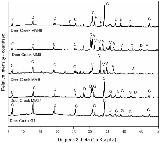 A variety of methods were used for mineral identification. These included optical microcopy, X-ray diffraction, and SEM/EDS analysis. Petrographic thin sections were studied using a Leitz petrographic microscope equipped with a 5-megapixel CMOS microscope camera. SEM images were obtained using a Tescan Vega III SEM (Brno, Czech Republic), with elemental microanalyses performed with an Oxford energy-dispersive X-ray detector using AzTek 4.0 analytical software, analyzing regions on polished blocks mounted horizontally on 1 cm diameter aluminum stubs. Because XRF oxygen peaks are poorly quantifiable, the oxygen values for silicate minerals were calculated based on stoichiometry. A limitation of XRF analysis is that there is no distinction between ferrous and ferric oxidation states. In Table 1, total iron is calculated as FeO.