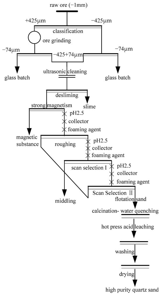 The prepared 74–425 μm raw quartz sand was subjected to ultrasonic scrubbing and desliming, magnetic separation, flotation, high-temperature calcined water quenching, and hot-pressure acid leaching to obtain high-purity quartz concentrate.