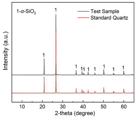 Figure 2 shows the results of the characteristic analysis of the vein quartz from the raw material. In Figure 2a, the vein quartz of the raw material is milky white and opaque. By SEM, Figure 2b shows primary quartz ore with co-associated feldspar minerals. In Figure 2c–f, the quartz crystals contain a large number of gas-liquid inclusions and turbidity under a single light microscope; the particle size of the inclusions was mostly less than 5 μm, and some of the particle sizes were 5–15 μm. Figure 3 shows the XRD diffractogram of the raw ore, and the spectrum of the test sample matches the spectrum of the standard quartz, indicating that the test sample is vein quartz with high purity. Table 2 shows the results of the XRD analysis of vein quartz from the raw material. The mineral content of quartz, mica, feldspar, kaolinite, and rutile was 98.93%, 0.92%, 0.12%, 0.03%, and 0.01%, respectively.