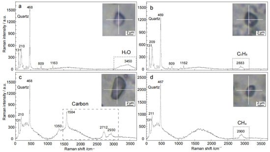 The laser Raman spectroscopy analysis revealed the composition of fluid inclusions: (a) single-phase pure gas inclusions with molecular water characteristics in the 3450 cm−1 band; (b) gas-liquid two-phase inclusions with C3H8 characteristics in the 2883 cm−1 band; (c) inclusions with carbonaceous characteristics in the 1584 cm−1, 2712 cm−1, and 2930 cm−1 bands; (d) single-phase pure gas-phase inclusions with CH4 characteristics in the 2900 cm−1 band.