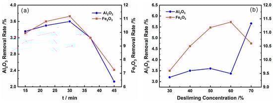 As shown in Figure 5a, as the scrubbing time increases, the yield of the removed ore slurry gradually increases. The optimal desliming effect is achieved when scrubbing for 30 min. At this time, the Fe2O3 and Al2O3 removed from the slime account for 11.18% and 3.6%, respectively. Figure 5b shows that with increasing slurry concentration, iron and aluminum removal gradually increases, and the desliming effect is better when the slurry concentration is 50%.