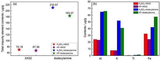 According to Figure 6a, under the new agent XK02, the quartz concentrate has a total impurity content of 70.18 μg/g when the slurry is adjusted with H2SO4 and 67.36 μg/g when the slurry is adjusted with HF, both of which are < 100 μg/g, and ω (SiO2) > 99.99%. However, under the dodecylamine agent, the total impurity content is 210.57 μg/g when the slurry is adjusted with H2SO4 and 183.27 μg/g when the slurry is adjusted with HF.