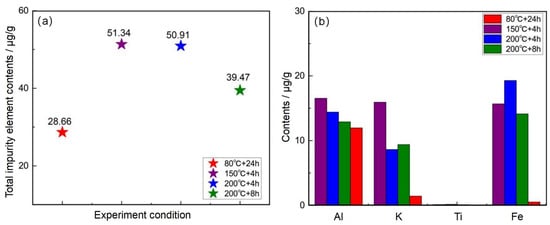 As shown in Figure 7, when leaching at 80 °C + 24 h, the lowest total amount of impurities in the quartz concentrate is 28.66 μg/g, and the grade of SiO2 reaches a maximum of 99.997%. When leaching at 150 °C for 4 h, the total amount of impurities in the quartz concentrate is 51.34 μg/g; when leaching at 200 °C for 4 h, the total amount of impurities in the quartz concentrate is 50.91 μg/g; and when leaching at 200 °C for 8 h, the total amount of impurities in the quartz concentrate is 39.47 μg/g. At that time, the impurity contents of Al, K, and Fe are the lowest.
