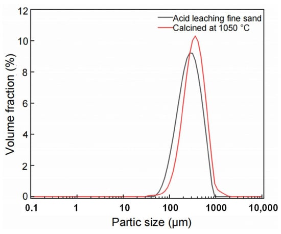In Figure 8, the trends in the particle size distribution of the quartz sand samples G1 and G2 are normal, indicating that the particle size distribution of the quartz sand samples is relatively uniform. G1 is a sample of quartz sand calcined at 1050 °C for 1 h, with an average particle size D50 of 367.91 μm. The main reason is that quartz undergoes a crystal structure transformation near 1050 °C, during which its volume expands. G2 is the sample after pressure acid leaching. The leaching system generates pressure, which further crushes the quartz sand. The average particle size D50 is 290.83 μm. This is because impurities are exposed on the surface from the inside out during the quenching process. During the leaching process, the leaching solution reacts with the impurities, causing corrosion to the quartz surface. Therefore, the particle size of the quartz sand decreases and the particle size of the quartz after leaching is smaller than after calcination [].