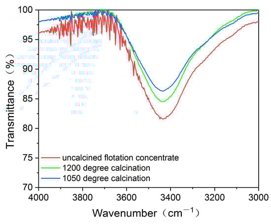 There are two forms of water in natural quartz: molecular water, which exists inside gas-liquid inclusions, and hydroxyl water, which exists in the lattice in the (-OH) form. The vibration of water molecules causes characteristic absorption in the infrared region, so infrared spectroscopy (FTIR) is an effective means to study the water content in gas-liquid inclusions in quartz sand. This study performed an infrared spectroscopy analysis on quartz sand particles from uncalcined flotation concentrate, calcined at 1050 °C and 1200 °C. The results are shown in Figure 10.