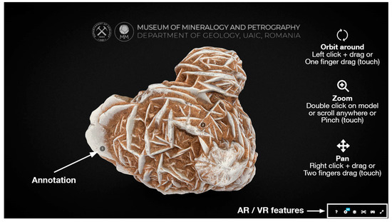 Sketchfab is the most widely used platform among 3D viewers (https://sketchfab.com) (accessed on 12 October 2024). However, there are other options available, such as Smithsonian Voyager [32], 3DHOP [33], Potree [34], Universal Viewer (https://universalviewer.io) (accessed on 12 October 2024), and Model-Viewer (https://github.com/google/model-viewer) (accessed on 12 October 2024). Each of these 3D viewers offers reliable solutions for the creation of 3D georepository of rocks and minerals or to integrate via their APIs into other existing mineralogical databases.