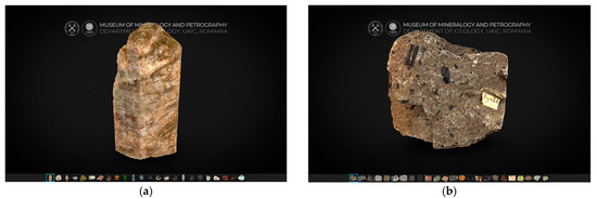 Main Sketchfab repository (with other 3D models, i.e., fossils, crystal forms, etc.): https://sketchfab.com/MineralogyPetrographyMuseum (accessed on 12 October 2024). Atlas of 3D rocks and minerals Sketchfab repository: https://skfb.ly/oywVs (accessed on 12 October 2024). Mobile Android app with Atlas of 3D rocks and minerals: https://play.google.com/store/apps/details?id=com.atlas.of.rocks.and.minerals (accessed on 12 October 2024). 3D storytelling repository: https://geology.uaic.ro/muzee/mineralogie/storytelling/ (accessed on 12 October 2024). HOLO×TALS app: https://geology.uaic.ro/muzee/mineralogie/holoxtals/ (accessed on 12 October 2024).