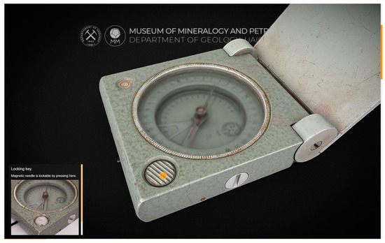 A 3D storytelling example developed by using the Sketchfab viewer API and representing a Freiberger geological compass used for measuring strike and dip: http://geology.uaic.ro/muzee/mineralogie/storytelling/freiberg_compass/ (accessed on 12 October 2024).