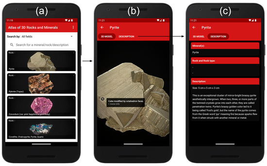 Screenshots of the mobile app repository of 3D rocks and minerals (Atlas of 3D Rocks and Minerals, https://play.google.com/store/apps/details?id=com.atlas.of.rocks.and.minerals) (accessed on 12 October 2024), where (a) represents the main display with the list of all samples, scrollable or filtered by search bar; (b) is a 3D view of the selected specimen with all annotations; and (c) is the full description associated with the selected entry.
