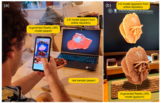 The use of augmented reality (AR) in the field of geosciences can be traced back to the early 2010s. It has been applied in several areas, such as geological visualization [28] and topographic interpretation [29]. Presently, the application of augmented reality in the geosciences is primarily associated with the use of AR sandbox technology [30,31]. The online database of 3D rocks and minerals also has augmented reality capabilities. This means that each specimen may be explored using a smartphone in various settings, such as classrooms, field trips, and museum presentations. Figure 5a demonstrates the application of AR to a jasper sample (https://skfb.ly/opLPs) (accessed on 12 October 2024). In this example, the actual sample is held in hand while a virtual replica is placed on the laptop keyboard. This can be positioned at any location, resized, and even animated in different situations. The augmented model of a gypsum desert rose (https://skfb.ly/6QUER) (accessed on 12 October 2024) can be seen in Figure 5b.