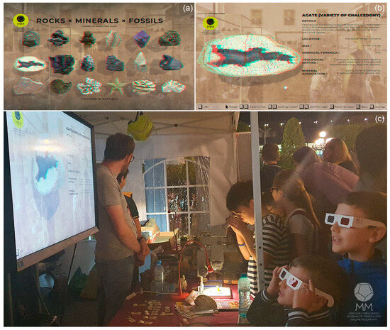 The AR application (HOLO×TALS, https://geology.uaic.ro/muzee/mineralogie/holoxtals/) (accessed on 12 October 2024) for 3D rocks and minerals, where (a) is the main scene where users can select the rock or mineral; (b) is the 3D model of the selected sample (agate) with the description; and (c) represents the work sequence of the chosen sample by using red-cyan 3D glasses.