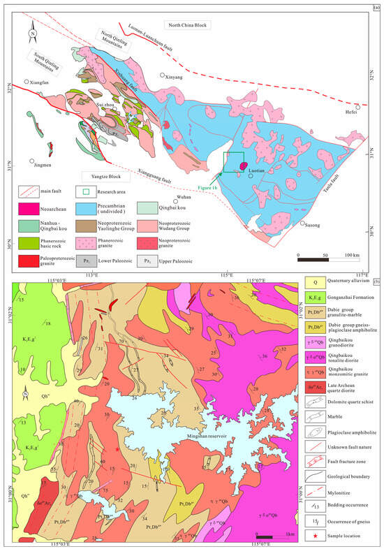 (a) Precambrian geological overview map of Qinling–Dabie Orogen; (b) geological map of the study area.