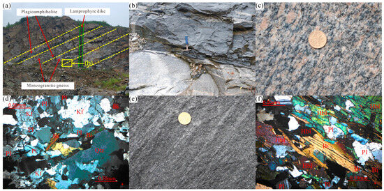 Field (a–c,e) and micrographs (d,f) of bimodal intrusive rocks in Mingshan reservoir in the north of Dabie Orogen. (a) Interbedded monzogranitic gneiss (light color) and plagioamphibolite (dark color); (b) contact relationship between monzogranitic gneiss (light color) and plagioamphibolite (dark color); (c) field photographs of monzogranitic gneiss; (d) orthonormal polariscope photographs of monzogranitic gneiss; (e) field photographs of plagioamphibolite; (f) orthonormal polariscope photographs of plagioamphibolite; Hbl—hornblende; Qtz—quartz; Pl—plagioclase; Kf—potassium feldspar; Bi—biotite.