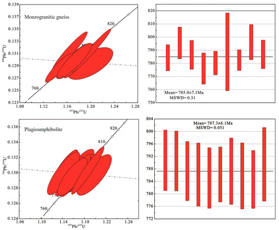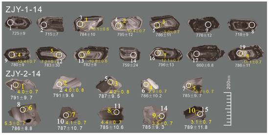 The zircon U-Pb dating data on the ZJY-1-14 and ZJY-2-14 samples are presented in Table 1. The cathode–luminescence images of the ZJY-1-14 sample reveal that the zircons are euhedral and have a well-defined crystal form, usually in cylindrical shape, with lengths ranging from 100 to 190 µm and widths from 35 to 105 µm. These zircons exhibit clear concentric rings, a uniform internal structure, and a distinctive “core-edge” structure, which are typical of late metamorphism (Figure 3). Six of the twenty zircons examined were eliminated due to concordant degrees of less than 95%, leaving fourteen genuine zircons. Th/U values ranged from 0.41 to 1.03, indicating clear magmatic zircon characteristics. The 206Pb/238U ages of nine zircons ranged from 776.1 ± 11.9 Ma to 796.3 ± 13.4 Ma, with the data points falling on or near the harmonic line (Figure 4). The weighted average age of these zircons was determined to be 786.1 ± 7.9 Ma (MSWD = 0.37) (Figure 4). The zircons belong to the Late Qingbaikou epoch and the Early Nanhua epoch, representing the crystallization age of the monzogranitic gneiss. The remaining five zircons had elliptic cores and varied internal structures. The 206Pb/238U ages ranged from 660 ± 6.8 Ma to 725 ± 9.1 Ma, which may be attributed to the Pb loss caused by intense Mesozoic tectonic activity in the area [42].