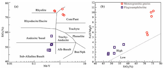 (a) Nb/Y-SiO2 diagram (after Winchester and Floyd, 1997 [46]) and (b) SiO2-FeOt/MgO diagram (after Miyashiro, 1975 [47]) for the bimodal intrusive rocks in Dabie Orogen.