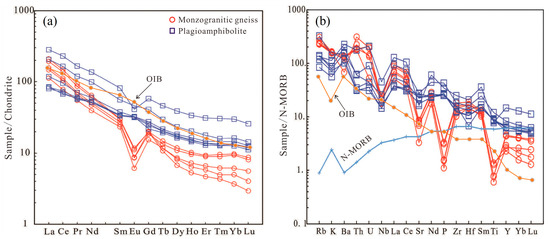 (a) Chondrite-normalized REE patterns and (b) N-MORB-normalized trace element patterns for the monzogranitic gneiss and plagioamphibolite in the Dabie Orogen. ((a) Normalizing values are from Boynton [48]; (b) normalizing values are from Sun and McDonough [49]).