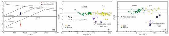 Zircon age—εHf(t) (a), Nb-Nb/U (b), and Ce-Ce/Pb (c) diagrams for plagioamphibolite ((b,c) after Hofmann et al., 1986 [50]).