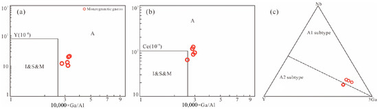 (a) Y and (b) Ce vs. 10,000* Ga/Al; (c) Nb-Y-3Ga discrimination diagram of monzogranitic gneiss in the Dabie Orogen ((a,b) after Whalen et al., 1987 [53]; (c) after Eby G N., 1992 [54]). Abbreviations: A: A-type granites; I: I-type granites; S: S-type granites; M: M-type granites. A1 = granitoids in anorogenic settings; A2 = post-orogenic granites emplaced after a continental collision.