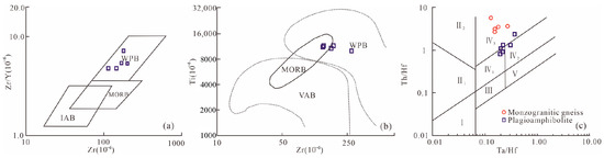 Zr-Zr/Y, Zr-Ti, and Ta/Hf-Th/Hf diagrams for the bimodal intrusive rocks in Dabie Orogen of Neoproterozoic era ((a,b) after Pearce et al., 1973 [56]; (c) after Wang Y L, 2001 [57]). I: N-MORB in diverging plate boundary; II: converging plate boundary; III: intra-oceanic plate; IV: intra-continental plate; V: basalt region in mantle plume; WPB: within plate basalt, VAB: volcanic arc basalt, MORB: mid-ocean ridge basalt.