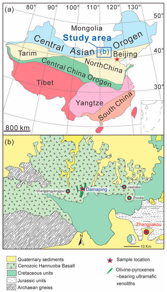 Location of the Damaping region showing (a) the tectonic framework of the northern North China Block, showing different sub-divisions and the location of the study area; and (b) the geology of the Damaping olivine deposits (modified after Yu et al., 2005) [].