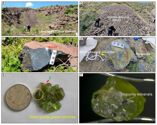 Representative field and sample photographs. (a) Damaping olivine open pit showing major volcanic rock; (b) basalt with deep-seated olivine; (c) fresh basalt without mantle xenoliths; (d) basalt with abundant olivine including gem-grade grains displaying different colours; (e) large bright green gem-grade olivine separated from xenoliths; and (f) green olivine with impurities (mainly magnetite) under binocular microscope. Note: the olivine (yellow circle in figure (e)) is magnified under a gem microscope.