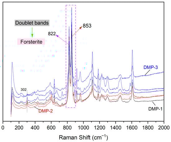 In this study, the representative analysed olivine displays concordant doublet bands in the 822 and 853 cm−1 range, which indicates typical forsterite (Figure 4). The 302 cm−1 range in the olivine is further suggestive of the end member of forsterite (Figure 4). However, the disparity between slight shifts may be attributed to the isotropic substitution between Mg2+ and Fe2+ [,,].