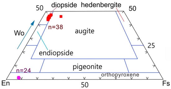 Geochemical diagrams showing the classification of pyroxenes (modified after Morimoto (1988) [] and Zhang et al. (2023) []); two main types of pyroxene are identified based on the diagram, with red and purple icons indicating clinopyroxene and orthopyroxene, respectively.