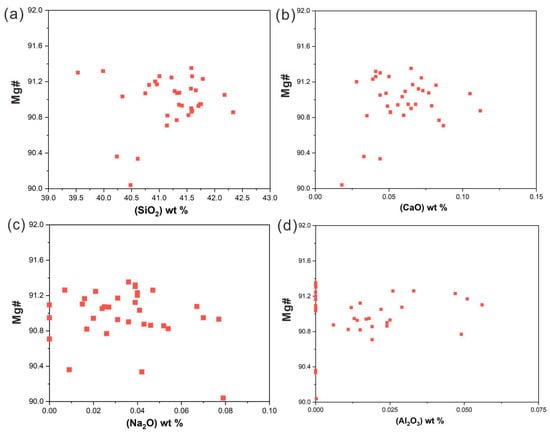 Plot of Mg# vs. SiO2, CaO, Na2O, and Al2O3 for assays of the olivine samples. (a) Mg# vs. SiO2 of olivine samples from mantle xenoliths. (b) Mg# vs. CaO of olivine from mantle xenoliths. (c) Mg# vs. Na2O of olivine from mantle xenoliths. (d) Mg# vs. Al2O3 of olivine from mantle xenoliths.