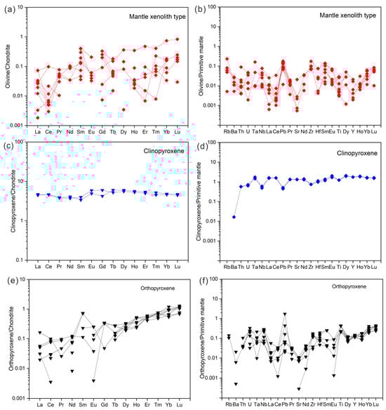 Normalised assays for the two types of olivine showing (a,b) chondrite-normalised REE patterns and primitive mantle-normalised trace element variation diagram in olivine; (c,d) chondrite-normalised REE patterns and primitive mantle-normalised trace element variation diagram in clinopyroxene (Cpx); (e,f) chondrite-normalised REE pattern and primitive mantle-normalised trace element variation diagram of the studied orthopyroxene (Opx). The geochemical data of upper crust are from Taylor and Mclennan (1995) [], and of chondrite are from McDonough and Sun (1995) [].