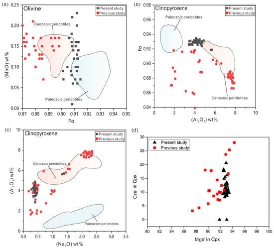 (a) Mg# vs. MnO of olivine samples from mantle xenoliths. (b) Al2O3 vs. Mg# of clinopyroxene from mantle xenoliths. (c) Al2O3 vs. Na2O of clinopyroxene from mantle xenoliths. Previous data (olivine and clinopyroxene in websterite xenoliths from Hannuoba) are cited by Duan et al. (2022) []. The diagrams are plotted based on previous investigations [,,,]. (d) Mg# vs. Cr# values for clinopyroxene (Cpx). Published related geochemical data (Mg# and Cr#) are from Yu et al. (2006) [].