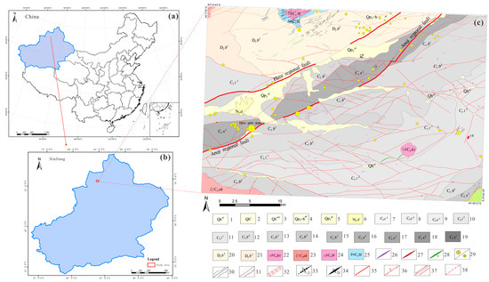 Geological map of the research area: (a) the geographical location of Xinjiang in China, (b) the geographical location of the Hatu metallogenic belt in the Xinjiang Uygur Autonomous Region, (c) a 1:50,000 geological map of Hatu research area. Legend: 1 = Fluvial Deposit; 2 = lake accumulation; 3 = Eluvium; 4 = Diluviumlayer (Upper Pleistocene to Holocene); 5 = Diluviumlayer (Upper Pleistocene); 6 = Dushanzi Formation; 7 = the third lithological segment of the Genghis Khan Formation; 8 = the second lithological segment of the Genghis Khan Formation; 9 = the first lithological segment of the Genghis Khan Formation; 10 = the second lithological segment of the Tailegula Formation; 11 = the first lithological segment of the Tailegula Formation; 12 = the fourth lithological segment of the Baogutu Formation; 13 = the third lithological segment of Baogutu Formation; 14 = the second lithological segment of Baogutu Formation; 15 = the first lithological segment of Baogutu Formation; 16 = the fourth lithological segment of the Xibeikulas Formation; 17 = the third lithological segment of the Xibeikulas Formation; 18 = the second lithological segment of the Xibeikulas Formation; 19 = the first lithological segment of the Xibeikulas Formation; 20 = the second lithological segment of the Balrek Formation; 21 = the first lithological segment of the Balrek Formation; 22 = Kushkuduk sequence granodiorite; 23 = Akbastao sequence potassium feldspar granite; 24 = Beilu Agaxi sequence granodiorite; 25 = Beilu Agaxi sequence quartz diorite; 26 = quartz vein; 27 = acidic rock vein; 28 = gabbro vein; 29 = gold deposit/gold mine point; 30 = geological boundary/angle unconformity boundary; 31 = phase transition boundary/ceratopsization; 32 = mylonitization zone; 33 = diagonal and numbering; 34 = anticline and number; 35 = regional fault; 36 = reverse; 37 = translational fault/general fault; 38 = inferred fault.